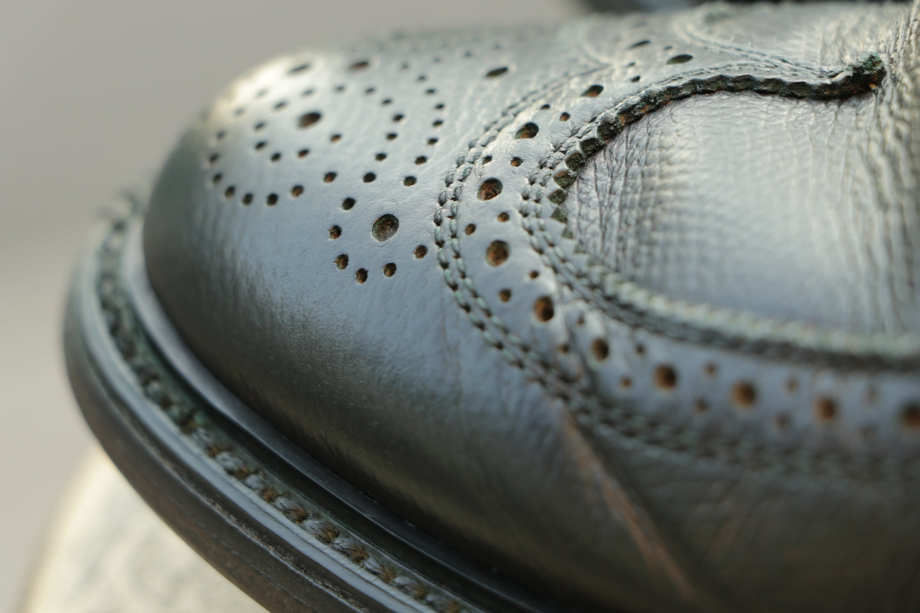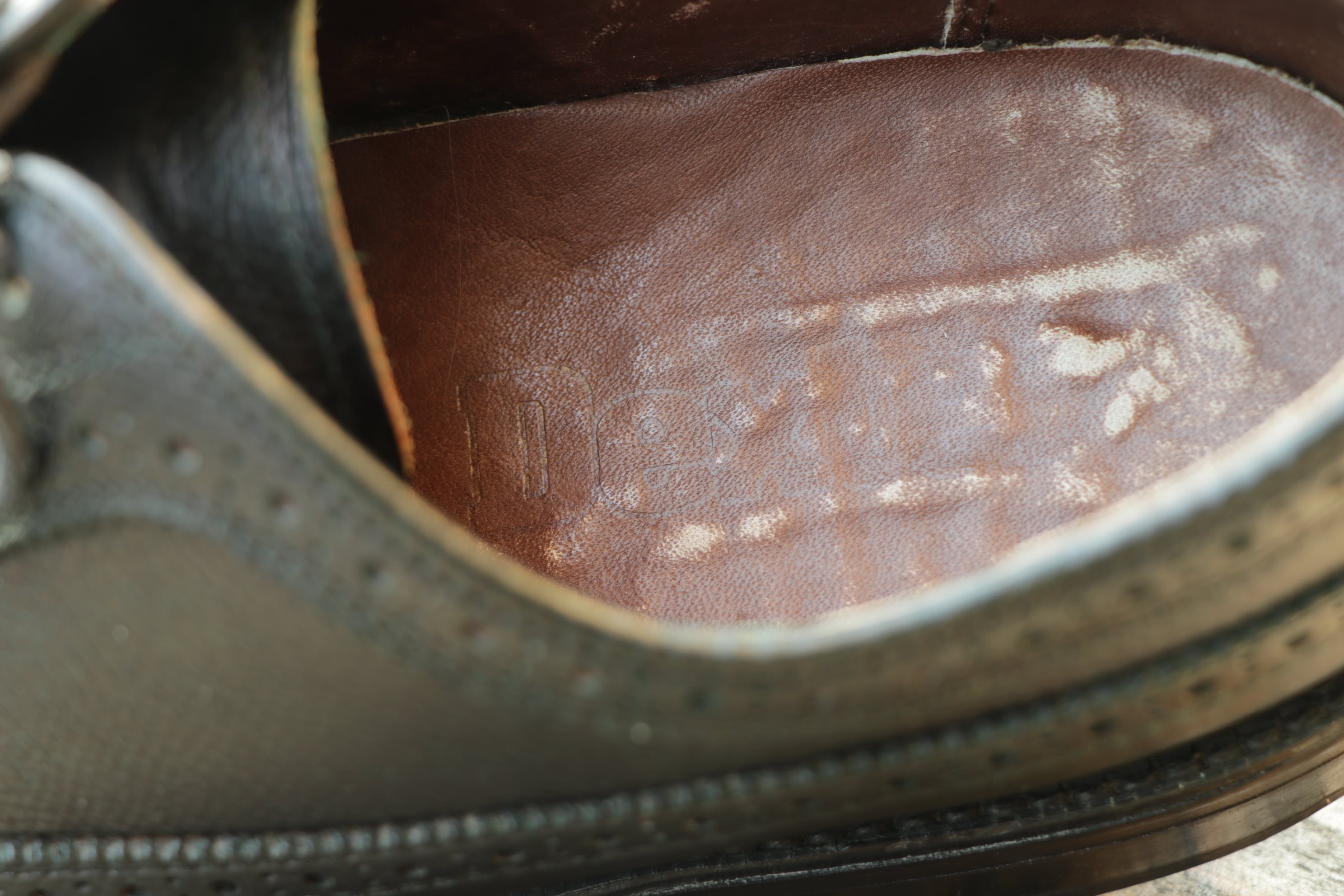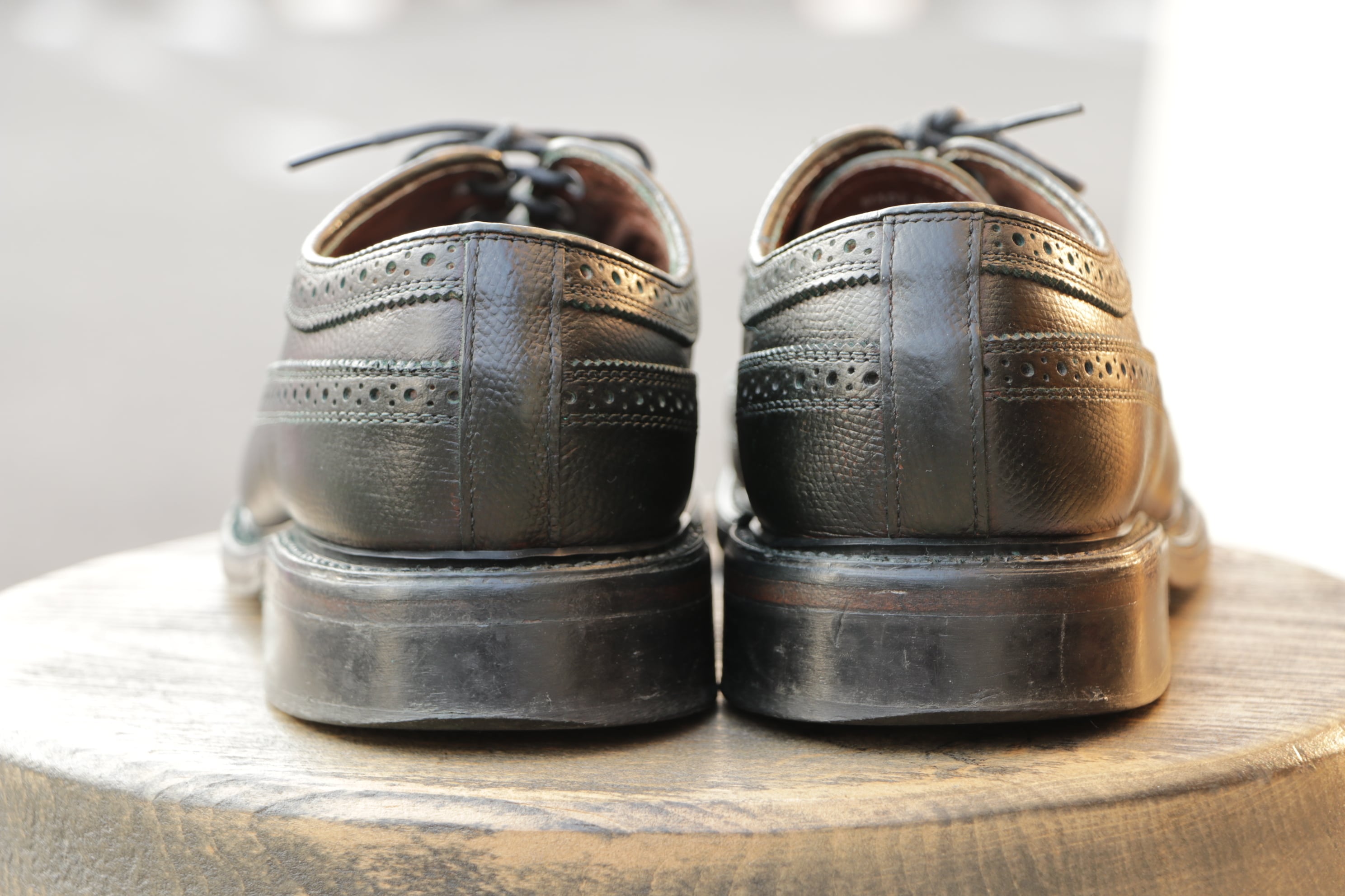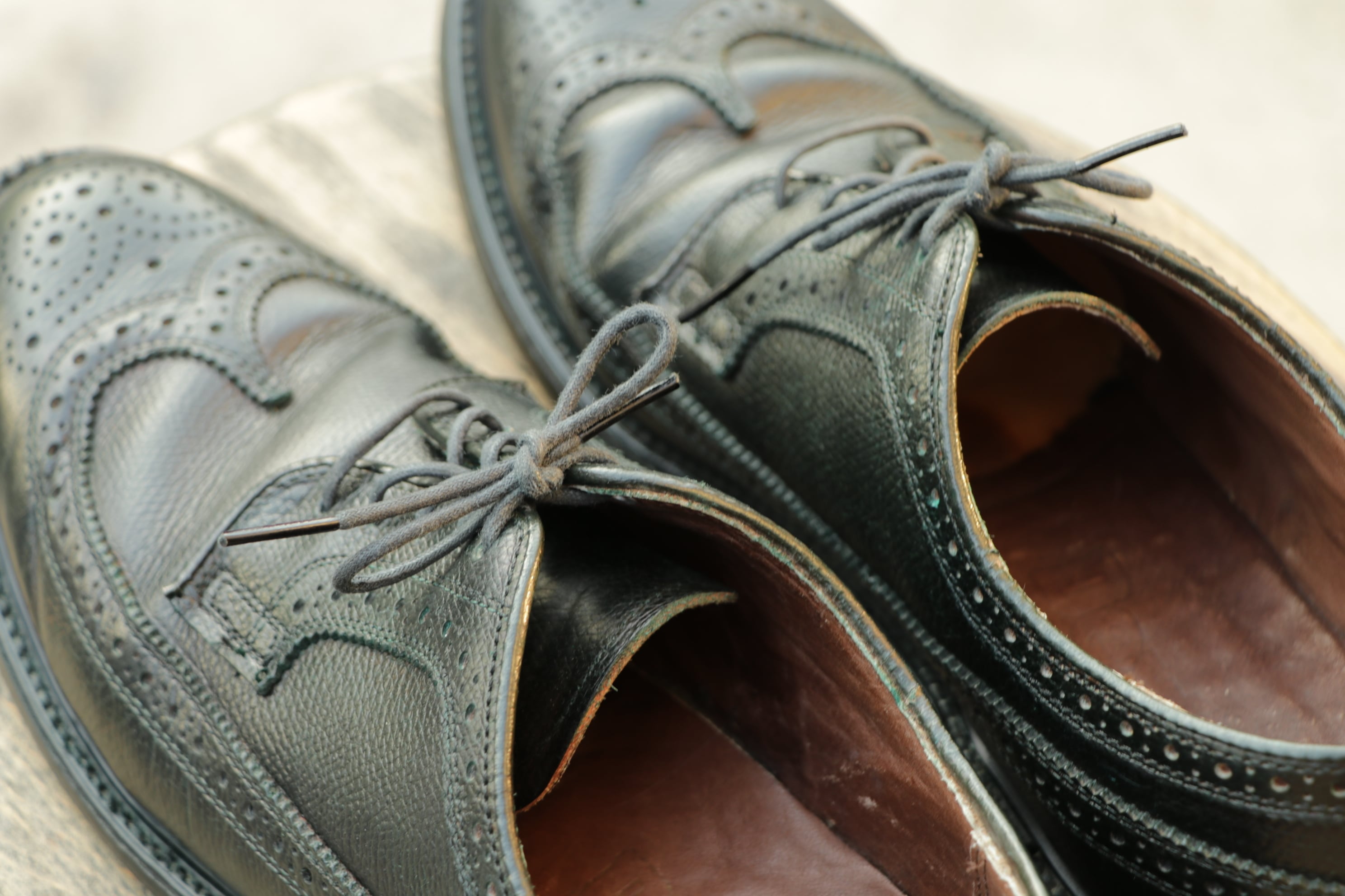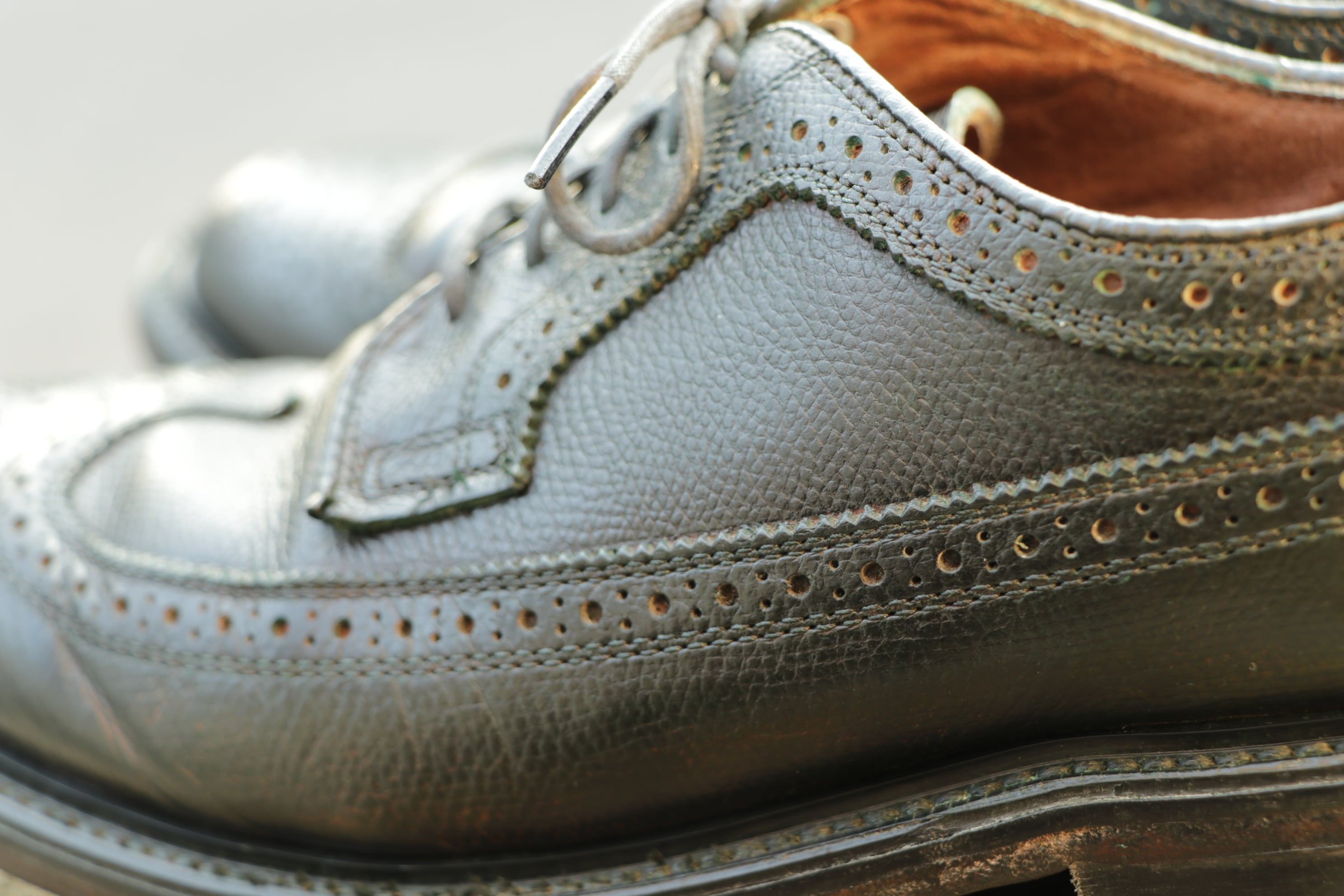 当店にてオリーブ色に染め替え処理を行っており、唯一無二の一足に仕上がりました。
